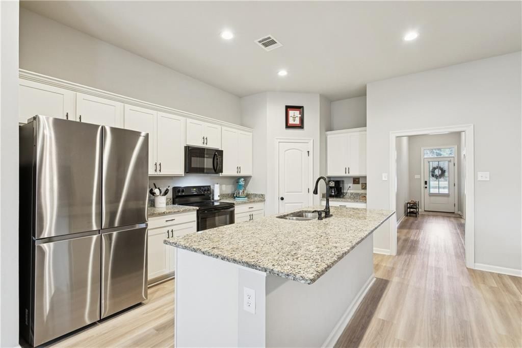This beautiful home is calling you! Spacious open floor plan offers ease of living. Kitchen has upgraded cabinets, granite countertops, large island, pantry and GE appliances. Den and dining have views of yard. Large primary bedroom with bath that has garden tub and separate shower, dual vanity and oversized closet. Vinyl plank flooring in all areas except two bedrooms that have carpet. Double car garage with attic access and app for convenient opening/closing. The tankless water heater gives the luxury of not running out of hot water. Home has a video surveillance system that will remain and monitoring can be maintained by new owner. This home is a must see, plan on viewing today!