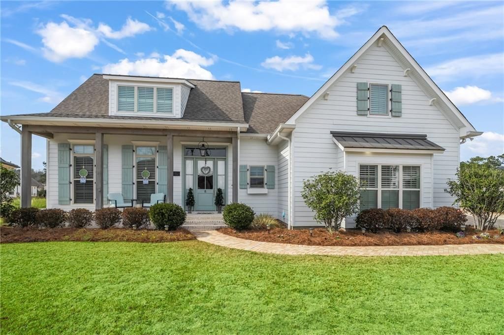 Situated within the gated, high-demand community of Maison du Lac, this stunning waterfront home blends refined coastal design with thoughtful architecture and exceptional livability. Positioned on an oversized cul-de-sac lot with serene water views, the property offers privacy, tranquility, and timeless curb appeal. Inside, soaring cathedral, vaulted, coffered, and tray ceilings combine with exposed wood beams, custom archways, and shiplap accents to create a cohesive coastal aesthetic. The light-filled living area is anchored by a gas brick fireplace and framed by expansive windows overlooking the water, while wide-plank flooring and designer finishes provide warmth and sophistication ideal for everyday living and entertaining. Kitchen features custom cabinetry with built-in organization, a statement vent hood, artisan tile backsplash, quartz countertops, an oversized island, walk-in pantry, and adjacent wet bar connecting the kitchen, dining, and living spaces. A distinctive Bourbon Room offers flexible use as a lounge, office, or entertaining space. The thoughtfully designed floor plan includes 5 bedrooms and 3.5 bathrooms, with 2 private en-suite bedrooms, 2 bedrooms connected by a Jack-and-Jill bath, and a spacious 2nd-floor suite with a half bath ideal as a 5 bedroom, bonus room, or media retreat. The primary suite features a spa-inspired bath with dual vanities, soaking tub, glass-enclosed shower, and custom tilework. Outdoor living shines with a large covered patio, surround sound, and fully equipped outdoor kitchen overlooking tranquil waterfront views. The stocked lake with fountains enhances the peaceful backyard setting. Addt' feats include a whole-house generator, plantation shutters, architectural ceilings throughout, custom tilework, seasonal exterior accent lighting, a spacious laundry room with sink/ ice maker, and Flood Zone X This exceptional home offers luxury waterfront living within one of Covington's most desirable gated communities.