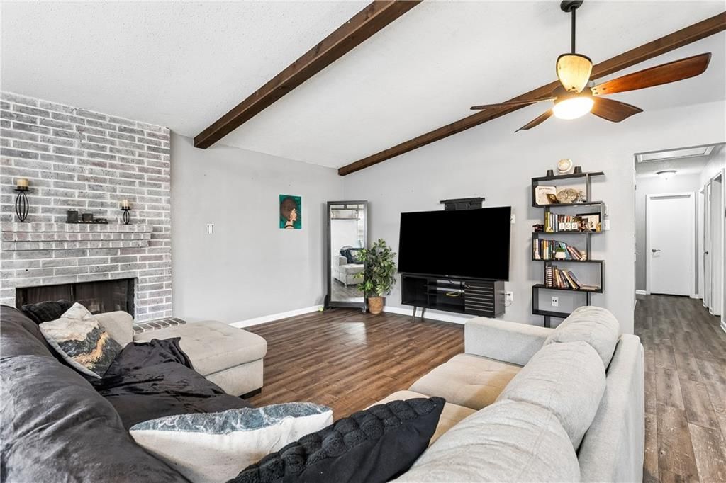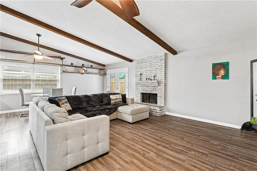 Welcome to 317 Somerset Drive in Slidell's Kingspoint subdivision! This 3-bedroom, 2-bath home offers a comfortable layout with updated finishes and a spacious backyard for everyday living. The living room features vaulted ceilings with exposed beams, wood-look flooring, and a painted brick fireplace that creates a warm focal point. The space flows into the dining area, where large windows bring in natural light and a glass door provides access to the backyard. The kitchen includes white cabinetry, granite countertops, a tile backsplash, and a peninsula with bar seating for casual dining and additional workspace. The primary bedroom features vaulted ceilings and wood-look flooring, along with an en suite bathroom offering a modern vanity and walk-in shower. Secondary bedrooms include updated flooring, ceiling fans, and natural light, while the additional bathroom offers a tub and shower combination. The fenced backyard provides open green space with tall trees and a storage building for added convenience. Schedule your private showing today!