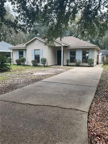 COZY & WELL MAINTAINED 3BR/2BA HOME WITH FENCED YARD, COVERED BACKYARD DECK & FIREPIT AREA FOR RELAXING & ENTERTAINING! Conveniently located to nearby shops & restaurants & easy access to Hwy 190 & I-12 for commutes. Living area features a spacious open concept floor plan with vaulted ceilings & lots of windows for natural light. The kitchen includes a dining area with windows overlooking the backyard, a counter bar for additional dining space, & all stainless steel/black appliances including refrigerator, range/oven, dishwasher & microwave. Large laundry room has additional storage space & washer/dryer is included! Spacious primary suite with walk-in closet & primary bath. Attractive lighting, ceiling fans & custom window blinds throughout home. Pet friendly!