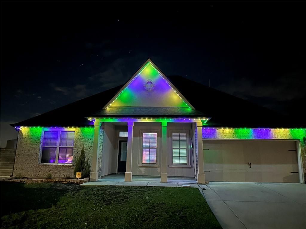 Located in the Lakeshore Villages community in Slidell, this home offers convenient access to New Orleans and a variety of neighborhood amenities. Community features include a pool with waterslides, fishing pier, playgrounds, and a splash pad. The home includes several interior upgrades designed for added function and organization. Custom cabinetry has been installed in the pantry, laundry room, and primary closet. Additional tile flooring has been added in the office and primary closet. Updated lighting fixtures, including crystal chandeliers, are installed in the living room, dining room, and primary bedroom. Outdoor living space includes a patio that spans the full length of the home, with a portion screened for additional use and comfort. An extended side driveway provides additional parking space suitable for multiple vehicles. Additional property features include solar panels and two Tesla Powerwall backup battery systems installed by Sunpro. The property also includes two electric vehicle charging stations: one located in the garage and one exterior charger designed for Tesla vehicles. Permanent Trimlight exterior lighting has been installed.